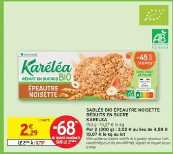 SABLÉS BIO ÉPEAUTRE NOISETTE RÉDUITS EN SUCRE KARELEA offres et promotions en ligne chez Intermarché