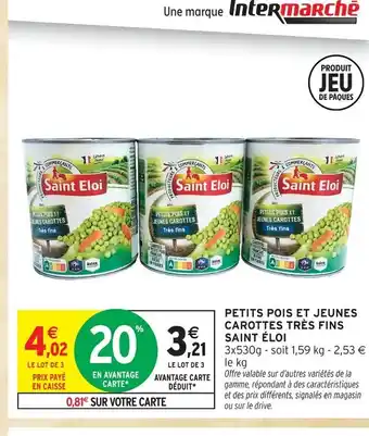 En plus de l'offre Saint eloi petits pois et jeunes carottes très fins, Intermarché propose une large gamme de produits. Consultez le Catalogue Intermarché Drive hebdomadaire pour découvrir les meilleures offres et promotions. En plus de Saint eloi petits pois et jeunes carottes très fins, il y a aussi : SAINT ÉLOI Petits pois et jeunes carottes très fins, PETITS POIS ET JEUNES CAROTTES TRÈS FINS SAINT ÉLOI & PETITS POIS TRÈS FINS NOTRE JARDIN.