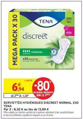 Actuellement en offre chez Intermarché : SERVIETTES HYGIÉNIQUES DISCREET NORMAL X30 TENA ✅ Valable du 17-03 au 29-03.
