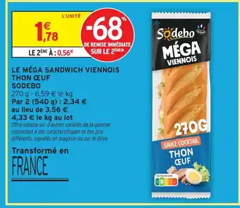 Actuellement en offre chez Intermarché : Sodebo le méga sandwich viennois thon œuf ✅ Valable du 20-01 au 1-02.