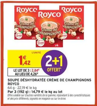 Actuellement en offre chez Intermarché : SOUPE DÉSHYDRATÉE CRÈME DE CHAMPIGNONS ROYCO ✅ Valable du 13-01 au 25-01.