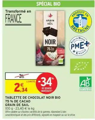 TABLETTE DE CHOCOLAT NOIR BIO 75% DE CACAO GRAIN DE SAIL : offres et promos Intermarché à découvrir