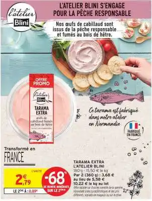 L'offre est disponible dans plusieurs magasins, vérifiez tous les produits pour obtenir le Tarama extra le moins cher. Si vous souhaitez savoir si l'article est en vente avec une plus grosse remise dans un autre magasin, consultez la catégorie 'Supermarché'. Ces offres pourraient aussi vous intéresser : L'ATELIER BLINI Tarama extra, Tarama blini & Blini tarama.