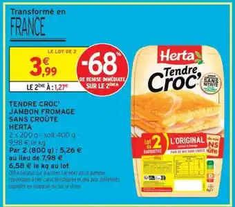 Actuellement en offre chez Intermarché : Tendre Croc Jambon Fromage Sans Croûte Herta ✅ Valable du 20-01 au 1-02.