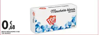 L'offre est disponible dans plusieurs magasins, vérifiez tous les produits pour obtenir le Top budget mouchoirs blancs x 15 le moins cher. Si vous souhaitez savoir si l'article est en vente avec une plus grosse remise dans un autre magasin, consultez la catégorie 'Supermarché'. Ces offres pourraient aussi vous intéresser : TOP BUDGET Boite mouchoirs x 150, TOP BUDGET Boite mouchoirs x 150 & TOP BUDGET Limonade.