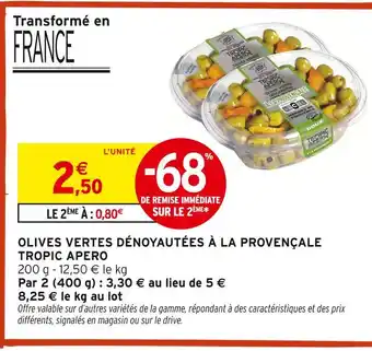 Actuellement en offre chez Intermarché : Tropic apero olives vertes dénoyautées à la provençale ✅ Valable du 13-01 au 25-01.