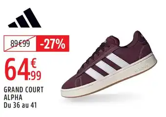 L'offre est disponible dans plusieurs magasins, vérifiez tous les produits pour obtenir le Grand court alpha le moins cher. Si vous souhaitez savoir si l'article est en vente avec une plus grosse remise dans un autre magasin, consultez la catégorie 'Sport'. Ces offres pourraient aussi vous intéresser : Grand court alpha, Adidas grand court alpha & Matelas Alpha 2.