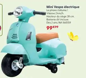 Mini Vespa électrique bénéficie actuellement d'une réduction chez JouéClub. Vous trouverez ici toutes les infos utiles sur les prix, la durée de validité et les conditions de l’offre. Pensez à consulter aussi d'autres offres et promotions similaires pour Mini Vespa électrique afin d’acheter toujours au bon prix. La promo Mini Vespa électrique est valable du 07-04-2026 au 28-04-2026. Offre terminée ? Pas de souci. D'autres offres sur ces produits sont peut-être déjà disponibles. Vous pouvez suivre cette catégorie de produits pour rester informé en cas de nouvelle promotion Mini Vespa électrique chez JouéClub. En comparant les offres, vous êtes sûr d’acheter au prix le plus bas possible.Questions fréquemment posées au sujet de Mini Vespa électrique