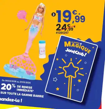 Le prix de l'offre Poupée sirène bulles magiques se trouve également en haut de la page, ainsi que la date à laquelle l'offre est disponible. Vous pouvez également vérifier les prix dans le Catalogue JouéClub actuel ou sur le site Internet de JouéClub. Les offres vous permettent d'acheter les produits JouéClub au prix le plus bas.