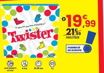 L'offre est disponible dans plusieurs magasins, vérifiez tous les produits pour obtenir le Twister le moins cher. Si vous souhaitez savoir si l'article est en vente avec une plus grosse remise dans un autre magasin, consultez la catégorie 'Jeux & Jouets'. Ces offres pourraient aussi vous intéresser : Twister, Hasbro games twister & offre 3.