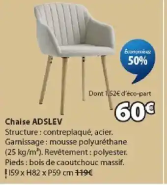 Actuellement, ADSLEV Chaise est en promotion chez JYSK. Toutes les informations utiles comme le prix, les conditions et la durée de validité sont affichées sur cette page. Consultez également les promotions similaires pour ADSLEV Chaise, afin de faire le meilleur choix. La promo ADSLEV Chaise est valable du 14-04-2026 au 11-05-2026. Si elle est expirée, regardez les autres offres équivalentes. Vous pouvez aussi suivre cette catégorie de produit pour être alerté lorsqu’une nouvelle promotion ADSLEV Chaise apparaît chez JYSK.Questions fréquemment posées au sujet de ADSLEV Chaise