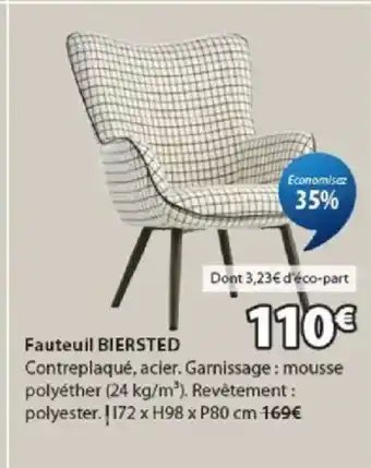 Le prix de l'offre BIERSTED Fauteuil se trouve également en haut de la page, ainsi que la date à laquelle l'offre est disponible. Vous pouvez également vérifier les prix dans le Catalogue JYSK actuel ou sur le site Internet de JYSK. Les offres vous permettent d'acheter les produits JYSK au prix le plus bas.