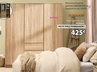 Actuellement, LIMFJORDEN Armoire est en promotion chez JYSK. Toutes les informations utiles comme le prix, les conditions et la durée de validité sont affichées sur cette page. Consultez également les promotions similaires pour LIMFJORDEN Armoire, afin de faire le meilleur choix. La promo LIMFJORDEN Armoire est valable du 01-01-2026 au 03-02-2026. Si elle est expirée, regardez les autres offres équivalentes. Vous pouvez aussi suivre cette catégorie de produit pour être alerté lorsqu’une nouvelle promotion LIMFJORDEN Armoire apparaît chez JYSK.Questions fréquemment posées au sujet de LIMFJORDEN Armoire