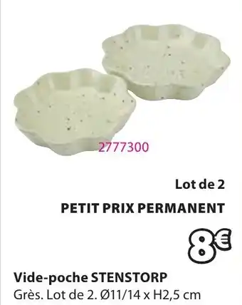 Cette STENSTORP Vide-poche est maintenant disponible chez JYSK. Découvrez toutes les promos en cours et profitez de réductions intéressantes. Commandez STENSTORP Vide-poche en ligne via le site officiel de JYSK ou achetez-la en magasin à un prix avantageux. Promocatalogues.fr réunit chaque jour les meilleures offres liées à STENSTORP Vide-poche. Envie d’être informé en premier ? Activez l’alerte en cliquant sur la cloche pour recevoir une notification gratuite dès que ce produit revient en promotion.Questions fréquemment posées au sujet de STENSTORP Vide-poche