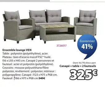 Actuellement, VEN Ensemble lounge est en promotion chez JYSK. Toutes les informations utiles comme le prix, les conditions et la durée de validité sont affichées sur cette page. Consultez également les promotions similaires pour VEN Ensemble lounge, afin de faire le meilleur choix. La promo VEN Ensemble lounge est valable du 17-03-2026 au 11-05-2026. Si elle est expirée, regardez les autres offres équivalentes. Vous pouvez aussi suivre cette catégorie de produit pour être alerté lorsqu’une nouvelle promotion VEN Ensemble lounge apparaît chez JYSK.Questions fréquemment posées au sujet de VEN Ensemble lounge