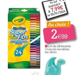 Cette Lot de 24 feutres Crayola lavables est maintenant disponible chez Kandy. Découvrez toutes les promos en cours et profitez de réductions intéressantes. Commandez Lot de 24 feutres Crayola lavables en ligne via le site officiel de Kandy ou achetez-la en magasin à un prix avantageux. Promocatalogues.fr réunit chaque jour les meilleures offres liées à Lot de 24 feutres Crayola lavables. Envie d’être informé en premier ? Activez l’alerte en cliquant sur la cloche pour recevoir une notification gratuite dès que ce produit revient en promotion.Questions fréquemment posées au sujet de Lot de 24 feutres Crayola lavables