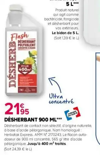 L'offre est disponible dans plusieurs magasins, vérifiez tous les produits pour obtenir le Désherbant le moins cher. Si vous souhaitez savoir si l'article est en vente avec une plus grosse remise dans un autre magasin, consultez la catégorie 'Jardineries et Animaleries'. Ces offres pourraient aussi vous intéresser : Désherbant polyvalent désherb'express, Désherbant concentré 910 ml & Désherbant hyper concentré 900 ml.