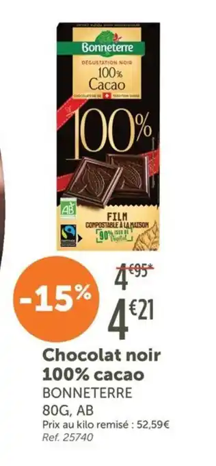 Actuellement en offre chez L'Eau Vive : BONNETERRE Chocolat noir 100% cacao ✅ Valable du 1-04 au 30-04.
