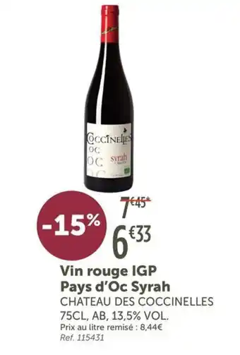 Vin rouge IGP Pays d'Oc Syrah CHATEAU DES COCCINELLES offres et promotions en ligne chez L'Eau Vive