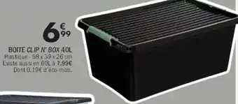 L'offre est disponible dans plusieurs magasins, vérifiez tous les produits pour obtenir le Boite clip n' box le moins cher. Si vous souhaitez savoir si l'article est en vente avec une plus grosse remise dans un autre magasin, consultez la catégorie 'Bazar et Déstockage'. Ces offres pourraient aussi vous intéresser : Boite clip n'box 40l, Boîte 301 funny box & Boîte funny box.