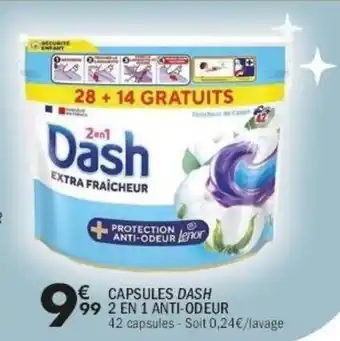 En plus de l'offre Capsules dash 2 en 1 anti odeur, La Foir'Fouille propose une large gamme de produits. Consultez le Catalogue La Foir'Fouille hebdomadaire pour découvrir les meilleures offres et promotions. En plus de Capsules dash 2 en 1 anti odeur, il y a aussi : Dash lessive capsules, DASH Capsules de lessive Envolée d'air & Kerotop combustible sans odeur.