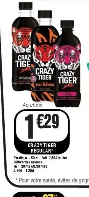 L'offre est disponible dans plusieurs magasins, vérifiez tous les produits pour obtenir le CRAZY TIGER Regular le moins cher. Si vous souhaitez savoir si l'article est en vente avec une plus grosse remise dans un autre magasin, consultez la catégorie 'Bazar et Déstockage'. Ces offres pourraient aussi vous intéresser : CRAZY TIGER Boisson énergisante original, BOISSON ÉNERGISANTE ORIGINAL CRAZY TIGER & Crazy tiger boisson énergisante original.