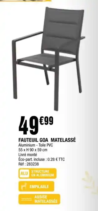 Le prix de l'offre FAUTEUIL GOA MATELASSÉ se trouve également en haut de la page, ainsi que la date à laquelle l'offre est disponible. Vous pouvez également vérifier les prix dans le Catalogue La Foir'Fouille actuel ou sur le site Internet de La Foir'Fouille. Les offres vous permettent d'acheter les produits La Foir'Fouille au prix le plus bas.