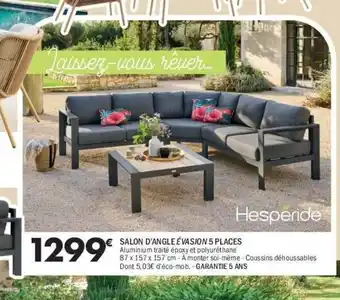 Le prix de l'offre HESPÉRIDE Salon d'angle évasion 5 places se trouve également en haut de la page, ainsi que la date à laquelle l'offre est disponible. Vous pouvez également vérifier les prix dans le Catalogue La Foir'Fouille actuel ou sur le site Internet de La Foir'Fouille. Les offres vous permettent d'acheter les produits La Foir'Fouille au prix le plus bas.