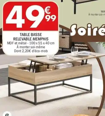 En plus de l'offre Table basse relevable memphis, La Foir'Fouille propose une large gamme de produits. Consultez le Catalogue La Foir'Fouille hebdomadaire pour découvrir les meilleures offres et promotions. En plus de Table basse relevable memphis, il y a aussi : TABLE BASSE RELEVABLE 'OSTARA', La table basse relevable aliaj & Table basse 103x38x63cm.