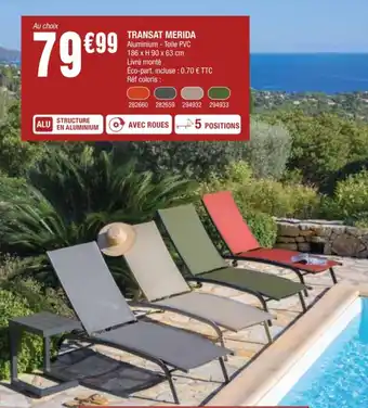 Actuellement, Transat merida est en promotion chez La Foir'Fouille. Toutes les informations utiles comme le prix, les conditions et la durée de validité sont affichées sur cette page. Consultez également les promotions similaires pour Transat merida, afin de faire le meilleur choix. La promo Transat merida est valable du 02-03-2026 au 31-08-2026. Si elle est expirée, regardez les autres offres équivalentes. Vous pouvez aussi suivre cette catégorie de produit pour être alerté lorsqu’une nouvelle promotion Transat merida apparaît chez La Foir'Fouille.Questions fréquemment posées au sujet de Transat merida