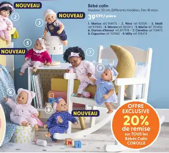 Le prix de l'offre Corolle bébé calin marius se trouve également en haut de la page, ainsi que la date à laquelle l'offre est disponible. Vous pouvez également vérifier les prix dans le Catalogue La Grande Récré actuel ou sur le site Internet de La Grande Récré. Les offres vous permettent d'acheter les produits La Grande Récré au prix le plus bas.