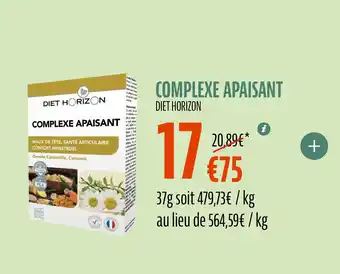 En plus de l'offre DIET HORIZON Complexe apaisant, La Vie Claire propose une large gamme de produits. Consultez le Catalogue La Vie Claire hebdomadaire pour découvrir les meilleures offres et promotions. En plus de DIET HORIZON Complexe apaisant, il y a aussi : DIET HORIZON Gluco chondro 2700, SANS COMPLEXE Ligne mathilde & SANS COMPLEXE Ligne arum.