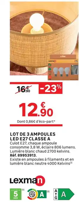 Actuellement en offre chez Leroy Merlin : Lexman lot de 3 ampoules led e27 classe a ✅ Valable du 1-04 au 28-04.