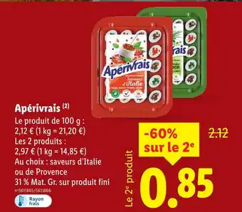 En plus de l'offre Apérivrais saveurs d’italie, Lidl propose une large gamme de produits. Consultez le Catalogue Lidl hebdomadaire pour découvrir les meilleures offres et promotions. En plus de Apérivrais saveurs d’italie, il y a aussi : APÉRIVRAIS saveurs d'Italie, Apérivrais - saveurs d'italie. 31% de mg sur tout fini & Aperivrais 20 bouchées saveurs de provence.