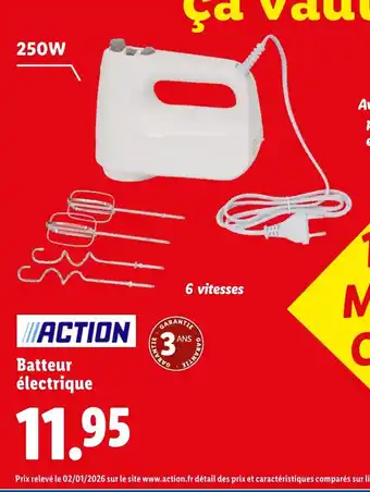 Batteur électrique bénéficie actuellement d'une réduction chez Lidl. Vous trouverez ici toutes les infos utiles sur les prix, la durée de validité et les conditions de l’offre. Pensez à consulter aussi d'autres offres et promotions similaires pour Batteur électrique afin d’acheter toujours au bon prix. La promo Batteur électrique est valable du 22-01-2026 au 26-01-2026. Offre terminée ? Pas de souci. D'autres offres sur ces produits sont peut-être déjà disponibles. Vous pouvez suivre cette catégorie de produits pour rester informé en cas de nouvelle promotion Batteur électrique chez Lidl. En comparant les offres, vous êtes sûr d’acheter au prix le plus bas possible.Questions fréquemment posées au sujet de Batteur électrique