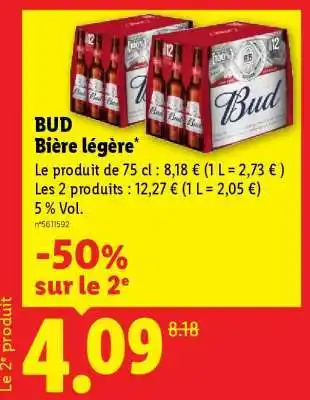 Actuellement, BUD Bière légère est en promotion chez Lidl. Toutes les informations utiles comme le prix, les conditions et la durée de validité sont affichées sur cette page. Consultez également les promotions similaires pour BUD Bière légère, afin de faire le meilleur choix. La promo BUD Bière légère est valable du 07-05-2026 au 13-05-2026. Si elle est expirée, regardez les autres offres équivalentes. Vous pouvez aussi suivre cette catégorie de produit pour être alerté lorsqu’une nouvelle promotion BUD Bière légère apparaît chez Lidl.Questions fréquemment posées au sujet de BUD Bière légère