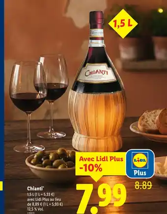 Actuellement, Chianti est en promotion chez Lidl. Toutes les informations utiles comme le prix, les conditions et la durée de validité sont affichées sur cette page. Consultez également les promotions similaires pour Chianti, afin de faire le meilleur choix. La promo Chianti est valable du 29-01-2026 au 04-02-2026. Si elle est expirée, regardez les autres offres équivalentes. Vous pouvez aussi suivre cette catégorie de produit pour être alerté lorsqu’une nouvelle promotion Chianti apparaît chez Lidl.Questions fréquemment posées au sujet de Chianti