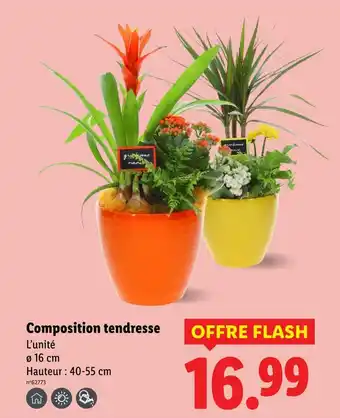 En plus de l'offre Composition tendresse, Lidl propose une large gamme de produits. Consultez le Catalogue Lidl hebdomadaire pour découvrir les meilleures offres et promotions. En plus de Composition tendresse, il y a aussi : Bouquet tendresse, LA COMPOSITION & Composition 2 Plantes.