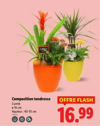 En plus de l'offre Composition tendresse, Lidl propose une large gamme de produits. Consultez le Catalogue Lidl hebdomadaire pour découvrir les meilleures offres et promotions. En plus de Composition tendresse, il y a aussi : Bouquet tendresse, Composition 2 Plantes & Composition camomille.