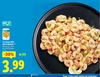 En plus de l'offre Crevettes ASC décortiquées, Lidl propose une large gamme de produits. Consultez le Catalogue Lidl hebdomadaire pour découvrir les meilleures offres et promotions. En plus de Crevettes ASC décortiquées, il y a aussi : DELPIERRE Crevettes décortiquées ASC, CARREFOUR Crevettes décortiquées sans sulfite ASC & Crevettes décortiquées cuites ASC surgelées COSTA.