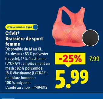 Actuellement en offre chez Lidl : CRIVIT Brassière de sport femme ✅ Valable du 19-02 au 25-02.