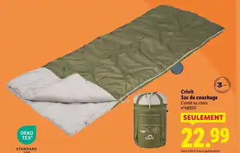 Actuellement, CRIVIT Sac de couchage est en promotion chez Lidl. Toutes les informations utiles comme le prix, les conditions et la durée de validité sont affichées sur cette page. Consultez également les promotions similaires pour CRIVIT Sac de couchage, afin de faire le meilleur choix. La promo CRIVIT Sac de couchage est valable du 19-02-2026 au 25-02-2026. Si elle est expirée, regardez les autres offres équivalentes. Vous pouvez aussi suivre cette catégorie de produit pour être alerté lorsqu’une nouvelle promotion CRIVIT Sac de couchage apparaît chez Lidl.Questions fréquemment posées au sujet de CRIVIT Sac de couchage