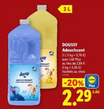 DOUSSY Adoucissant bénéficie actuellement d'une réduction chez Lidl. Vous trouverez ici toutes les infos utiles sur les prix, la durée de validité et les conditions de l’offre. Pensez à consulter aussi d'autres offres et promotions similaires pour DOUSSY Adoucissant afin d’acheter toujours au bon prix. La promo DOUSSY Adoucissant est valable du 09-04-2026 au 15-04-2026. Offre terminée ? Pas de souci. D'autres offres sur ces produits sont peut-être déjà disponibles. Vous pouvez suivre cette catégorie de produits pour rester informé en cas de nouvelle promotion DOUSSY Adoucissant chez Lidl. En comparant les offres, vous êtes sûr d’acheter au prix le plus bas possible.Questions fréquemment posées au sujet de DOUSSY Adoucissant