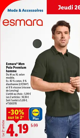 Actuellement en offre chez Lidl : ESMARA Men Polo Premium homme ✅ Valable du 26-02 au 2-03.