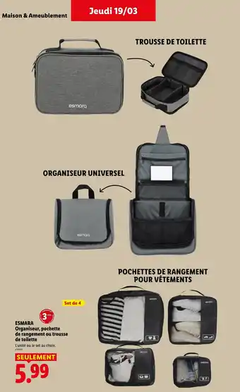 Actuellement en offre chez Lidl : ESMARA Organiseur, pochette de rangement ou trousse de toilette ✅ Valable du 19-03 au 25-03.