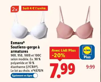Le prix de l'offre ESMARA Soutiens-gorge à armatures se trouve également en haut de la page, ainsi que la date à laquelle l'offre est disponible. Vous pouvez également vérifier les prix dans le Catalogue Lidl actuel ou sur le site Internet de Lidl. Les offres vous permettent d'acheter les produits Lidl au prix le plus bas.