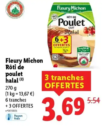 Le prix de l'offre FLEURY MICHON Rôti de poulet halal se trouve également en haut de la page, ainsi que la date à laquelle l'offre est disponible. Vous pouvez également vérifier les prix dans le Catalogue Lidl actuel ou sur le site Internet de Lidl. Les offres vous permettent d'acheter les produits Lidl au prix le plus bas.