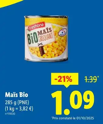 Actuellement en offre chez Lidl : Freshona maïs bio ✅ Valable du 22-01 au 28-01.