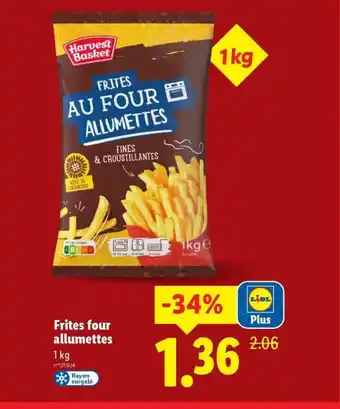 En plus de l'offre Frites four allumettes, Lidl propose une large gamme de produits. Consultez le Catalogue Lidl hebdomadaire pour découvrir les meilleures offres et promotions. En plus de Frites four allumettes, il y a aussi : Harvest basket frites four allumettes, Allumettes au four & Frites au four.