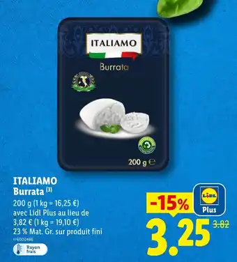 Actuellement, ITALIAMO Burrata est en promotion chez Lidl. Toutes les informations utiles comme le prix, les conditions et la durée de validité sont affichées sur cette page. Consultez également les promotions similaires pour ITALIAMO Burrata, afin de faire le meilleur choix. La promo ITALIAMO Burrata est valable du 16-04-2026 au 22-04-2026. Si elle est expirée, regardez les autres offres équivalentes. Vous pouvez aussi suivre cette catégorie de produit pour être alerté lorsqu’une nouvelle promotion ITALIAMO Burrata apparaît chez Lidl.Questions fréquemment posées au sujet de ITALIAMO Burrata